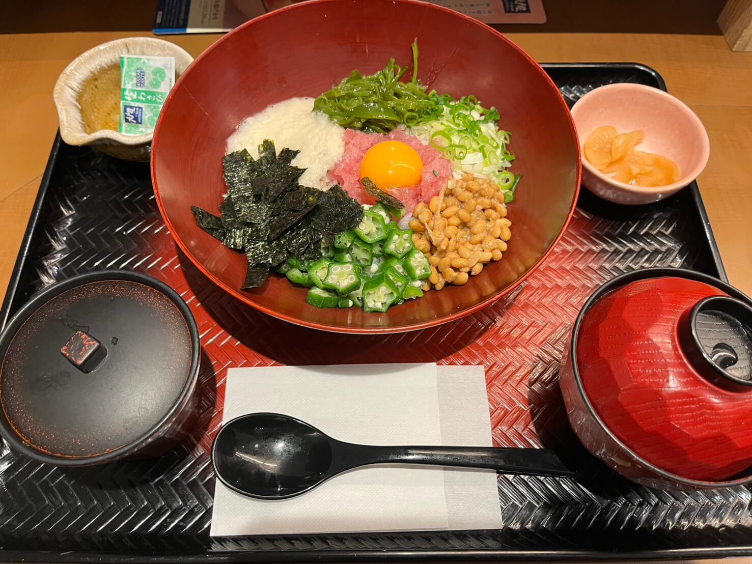 マグロや納豆、とろろのネバネバ食材で食べやすく、急いでランチを終わらせたいときにもおすすめの一品です。